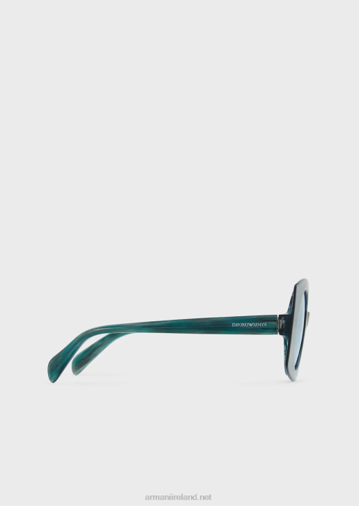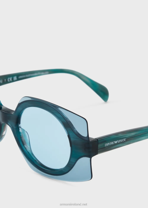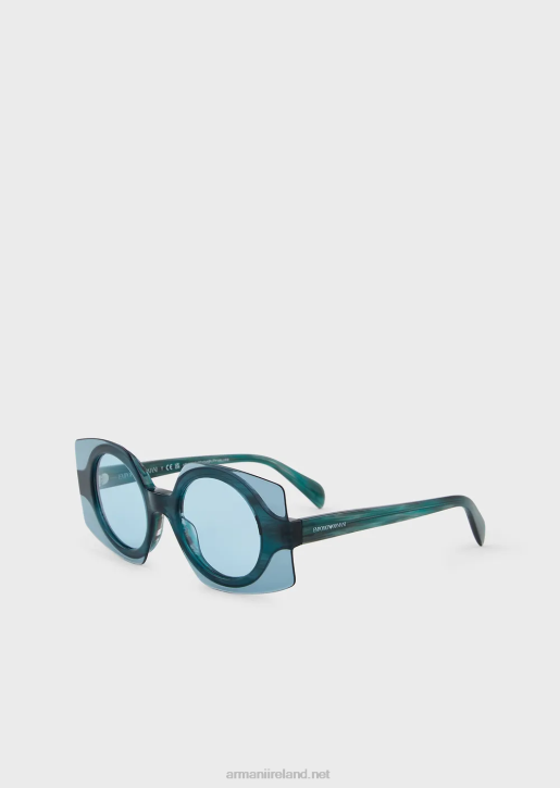 Women's sunglasses with an acetate structure in a futuristic design, featuring a double construction with an inner round shape and transparent outer square shape. Temples with Emporio Armani logo on the side.